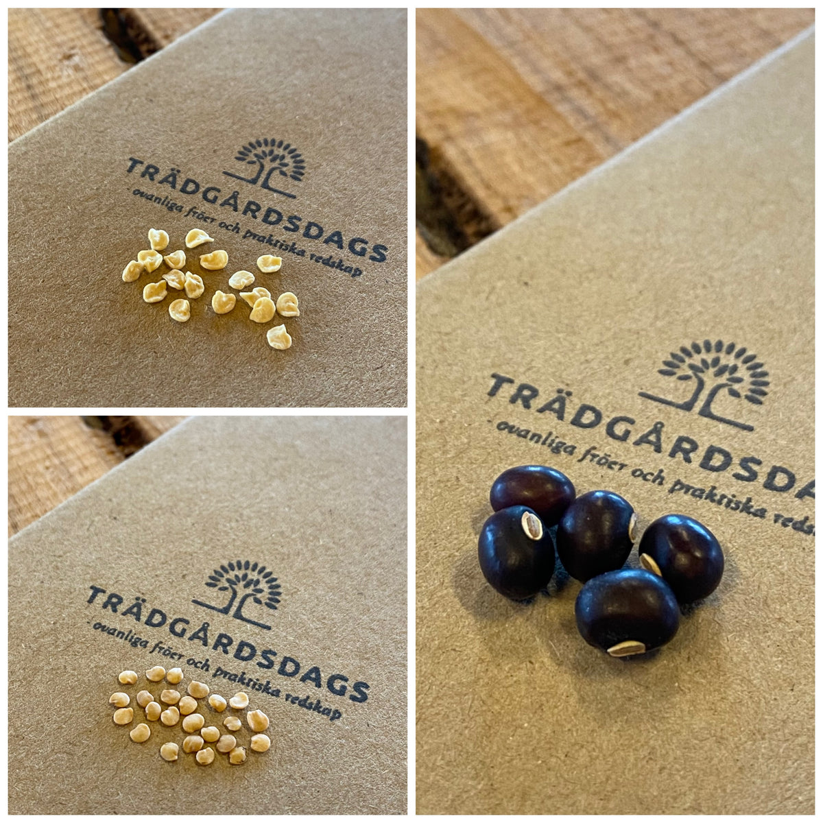 En trio av 3 olika frösorter med lilafärgade, ätbara frukter!