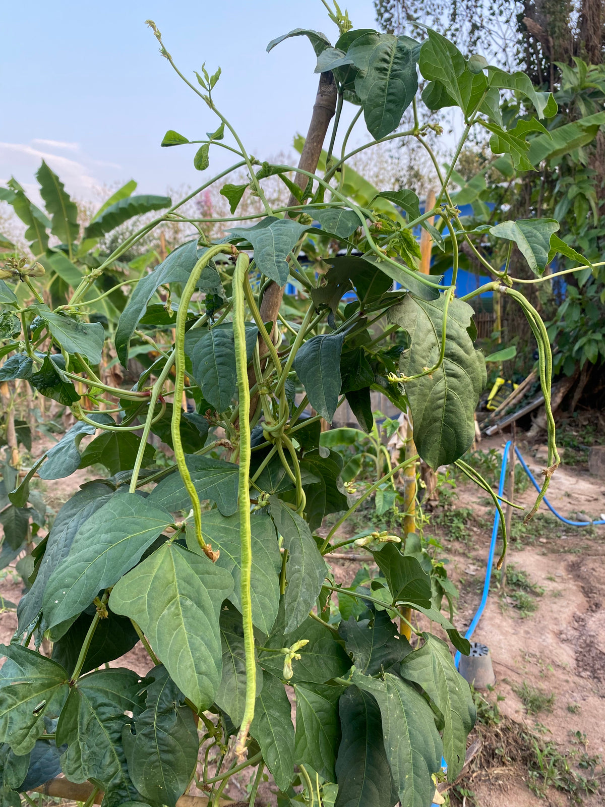 Långbönan är en s k störböna och har ett klättrande växtsätt. Ge den gärna lite utrymme och något att klättra på för att få en kraftig tillväxt och fruktsättning. När vuxet stadie är nått och temperaturen är runt 27-32°C växer långbönan kraftigt och producerar rikligt.