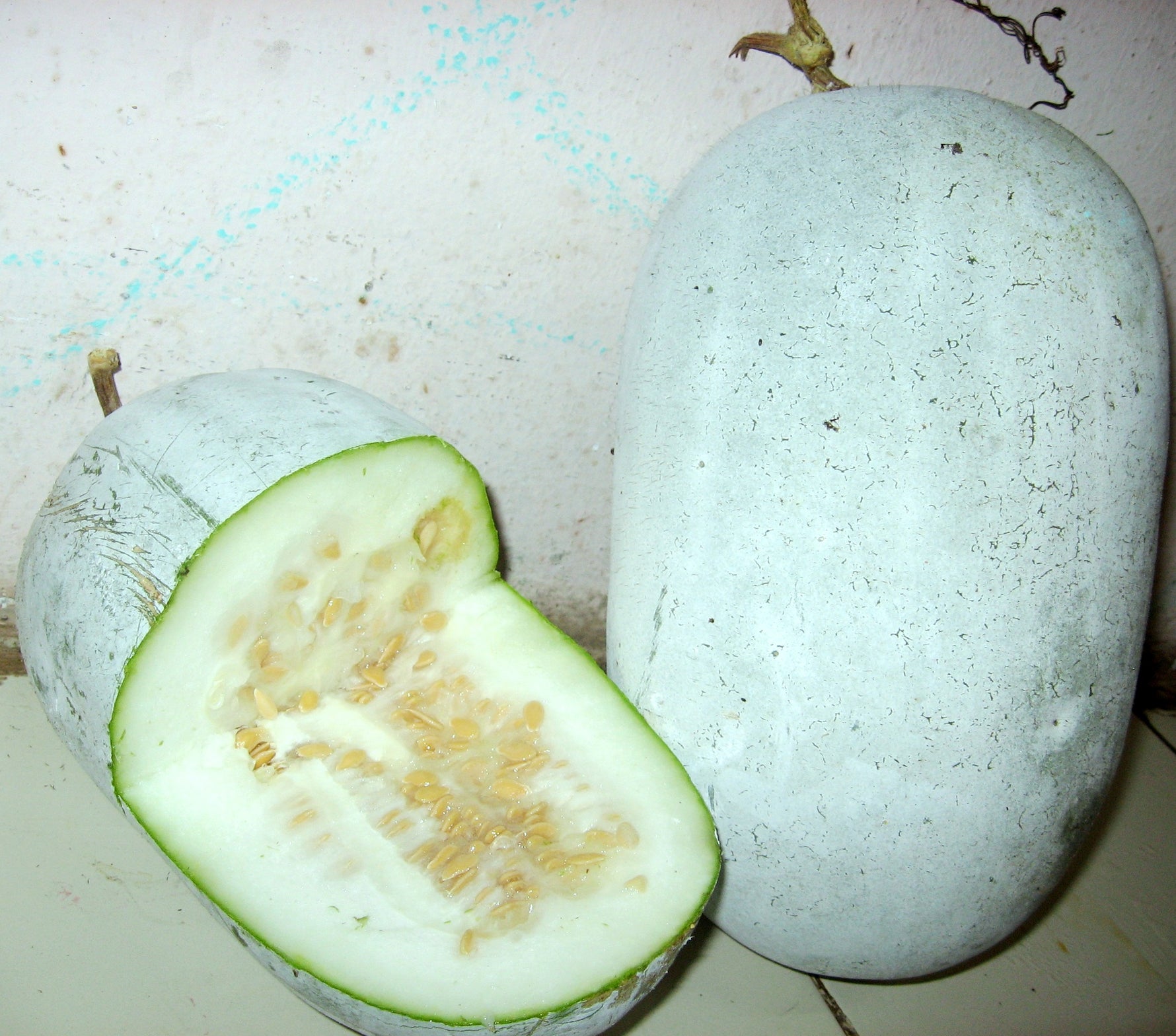 Trivialnamn: Vaxpumpa, Ätlig Vaxgurka, Vintermelon, Wax Gourd, Ash Gourd, Winter Melon
