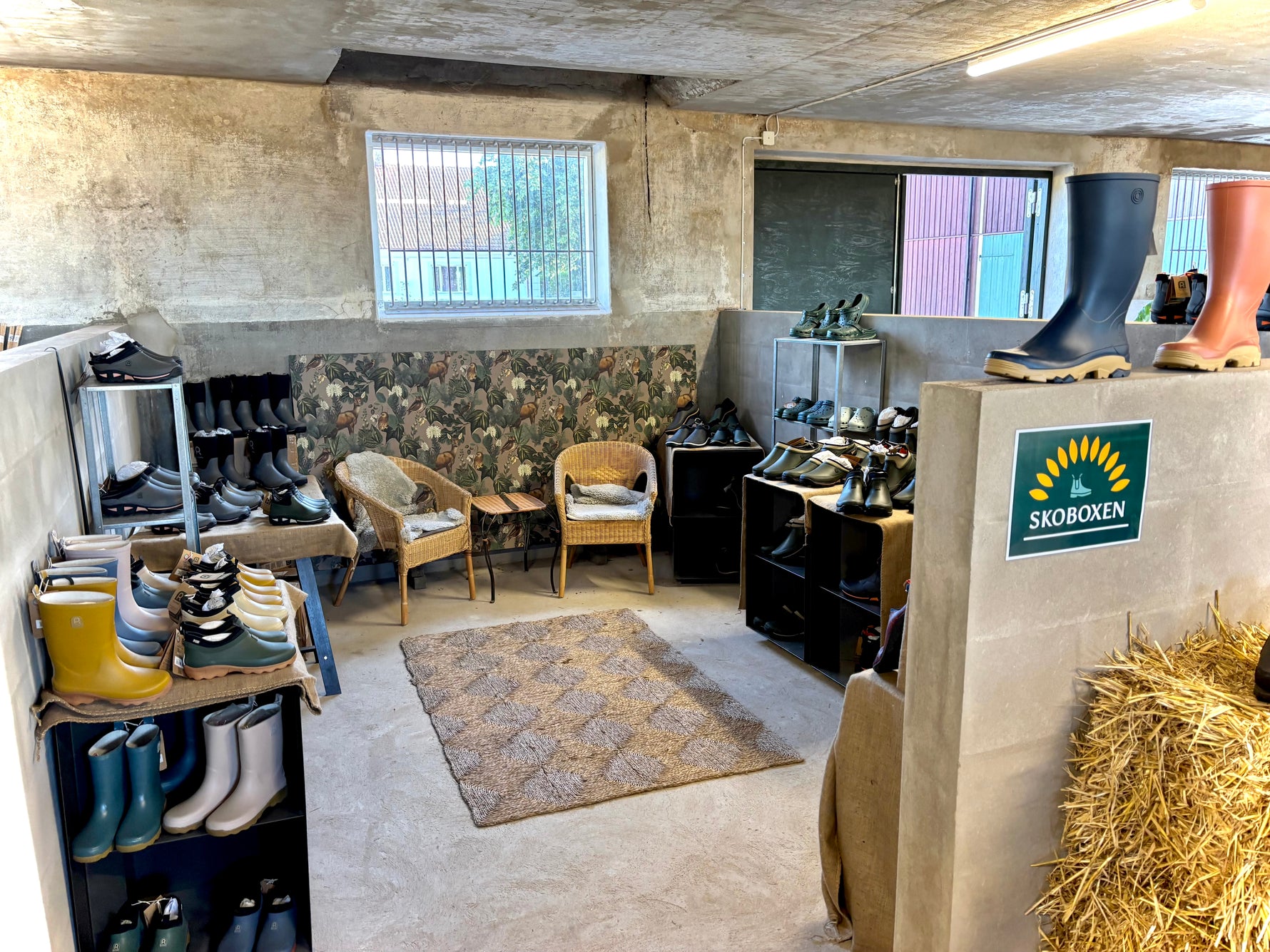 Inne i det nyrenoverande stallet har vi butiken. Vi har försett de olika boxarna med varsin avdelning: t ex Skoboxen, Fröboxen, Redskapsboxen osv.
