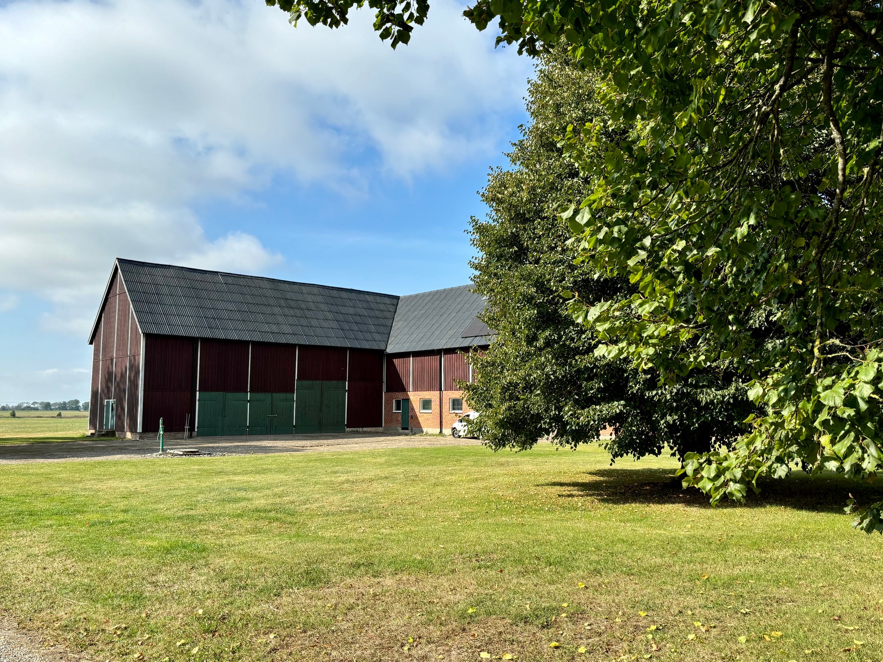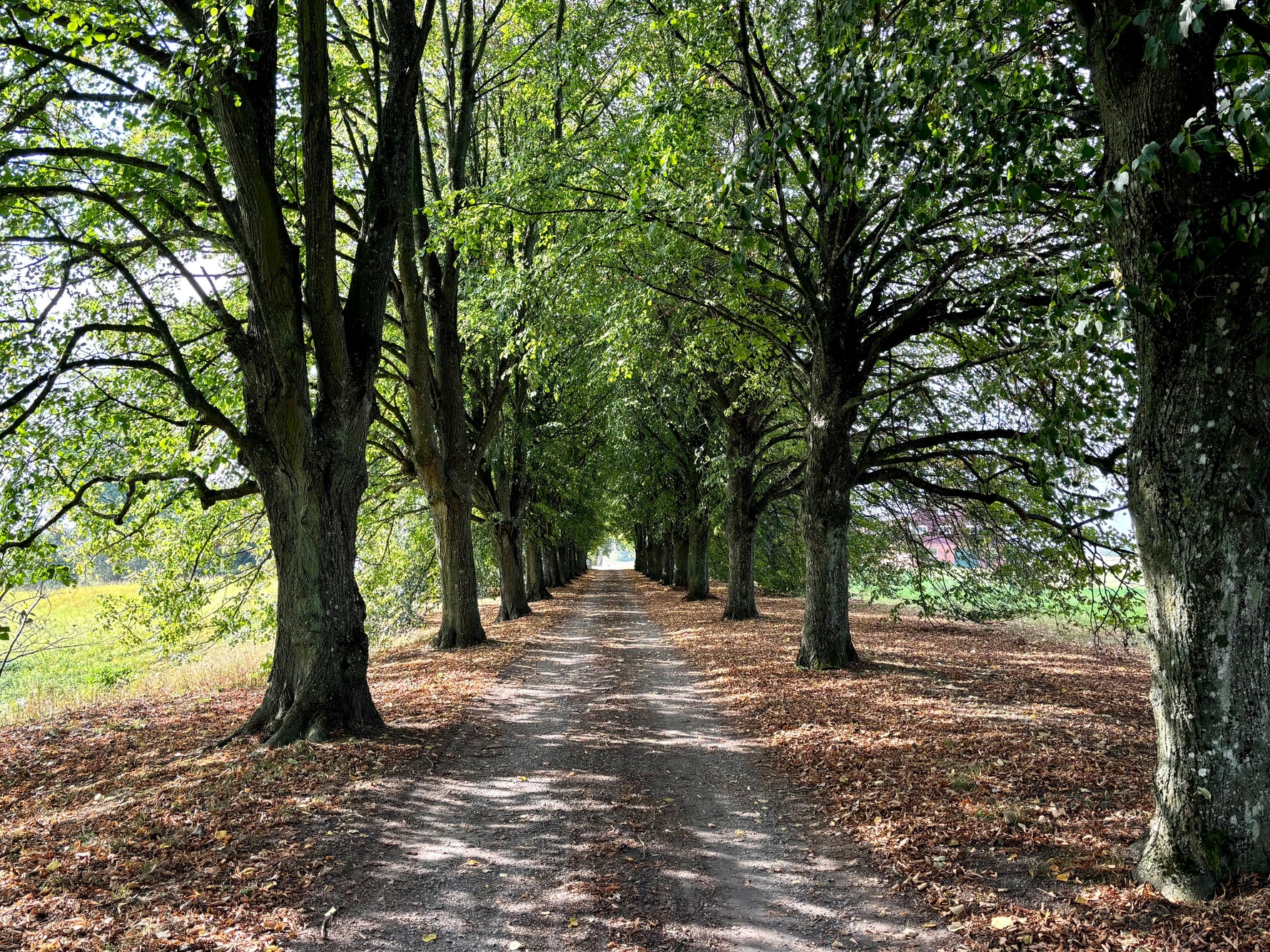 Kör in emot gården genom lindallén. Dess grenar på ytterkanterna hänger ned mot marken för att bilda en nästan portalliknande känsla när man för sig framåt.