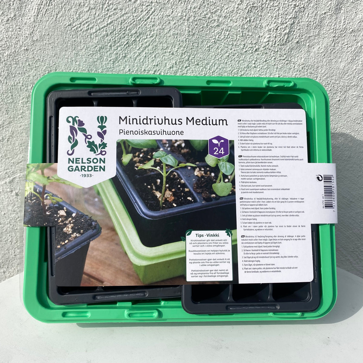 Minidrivhus för förodling eller drivning av sticklingar. 4 djupa krukinsatser med 6 celler i varje ingår.